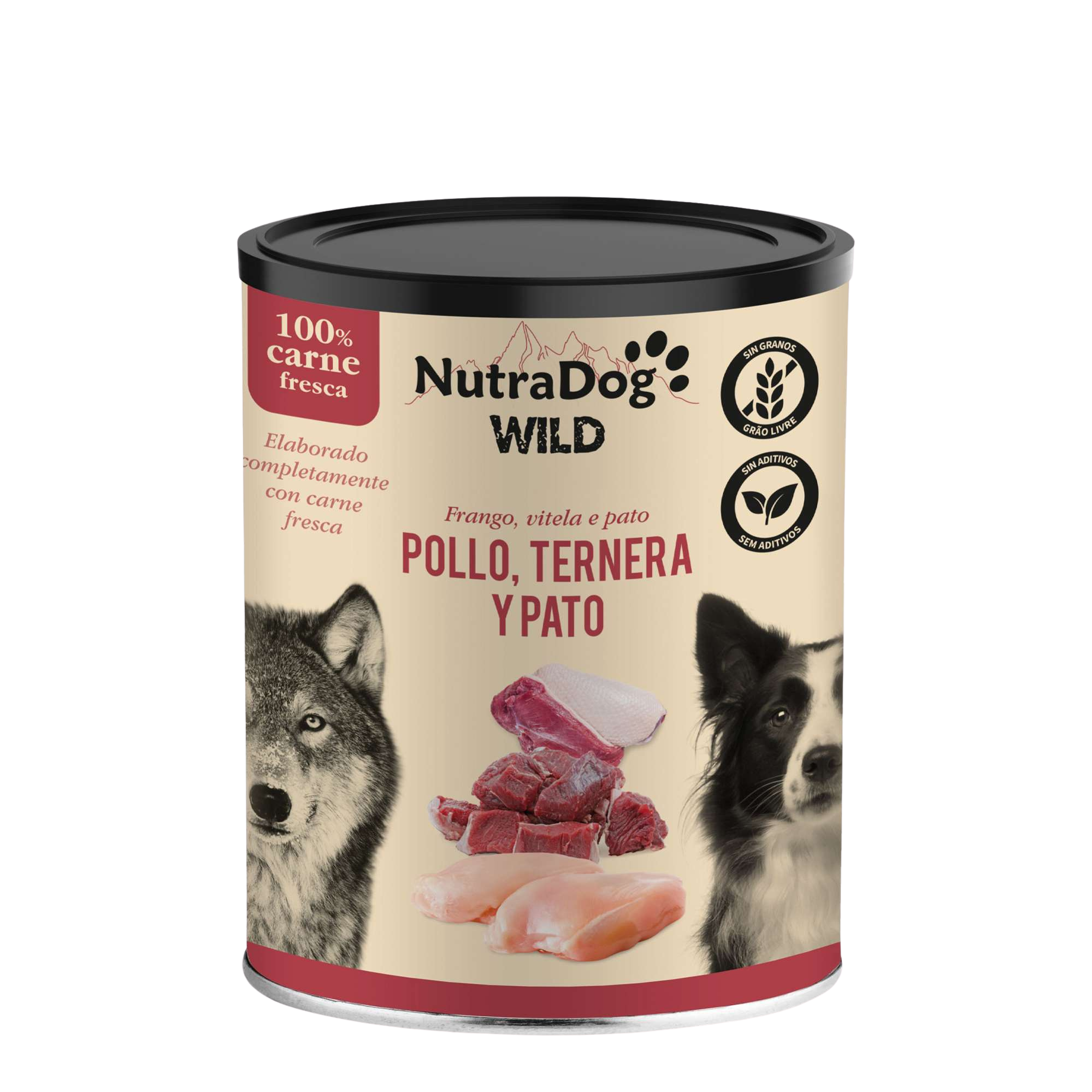 A ração húmida NutraDog WILD para cães é 100% natural, feita apenas com frango, carne bovina e pato. Os cães são carnívoros e precisam de uma dieta rica em carne e gorduras de qualidade para atender às suas necessidades proteicas. Este alimento é uma mistura ideal de frango e carne bovina, sem aditivos ou outros ingredientes.