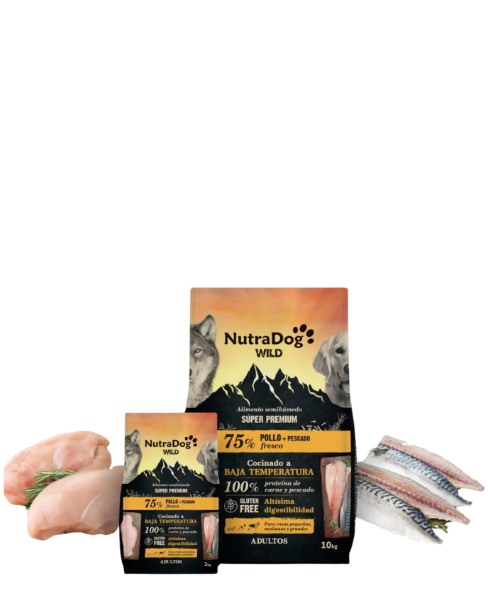NutraDog WILD 75% Frango + Peixe é um alimento saboroso para cães que contém 55% de frango fresco e 20% de peixe fresco . É ideal para cães adultos ativos que precisam de uma dieta equilibrada e de fácil digestão.