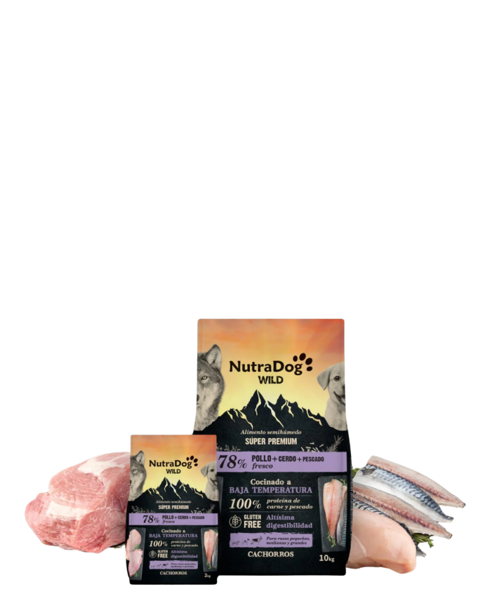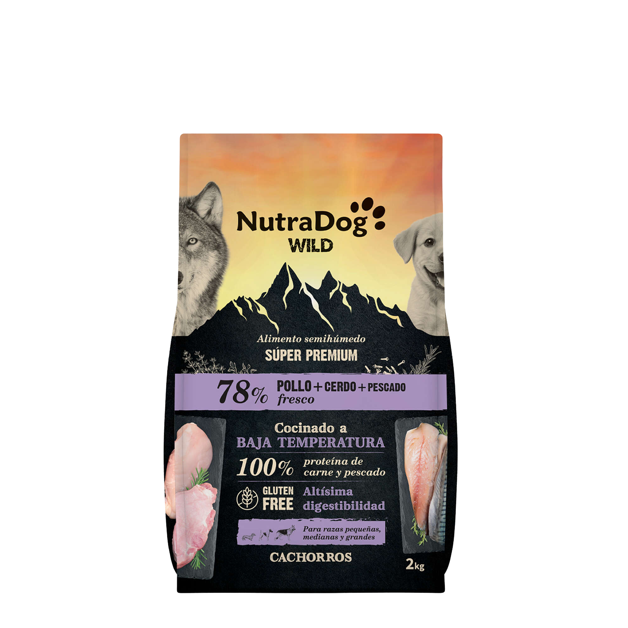 NutraDog WILD 78% Frango + Porco + Peixe é um alimento saboroso e nutritivo para filhotes, feito com 78% de carne e peixe frescos . Fornece uma alta quantidade de proteínas completas e gorduras essenciais , nutrientes muito necessários nos estágios iniciais de desenvolvimento para que nossos cães alcancem um crescimento completo e saudável.