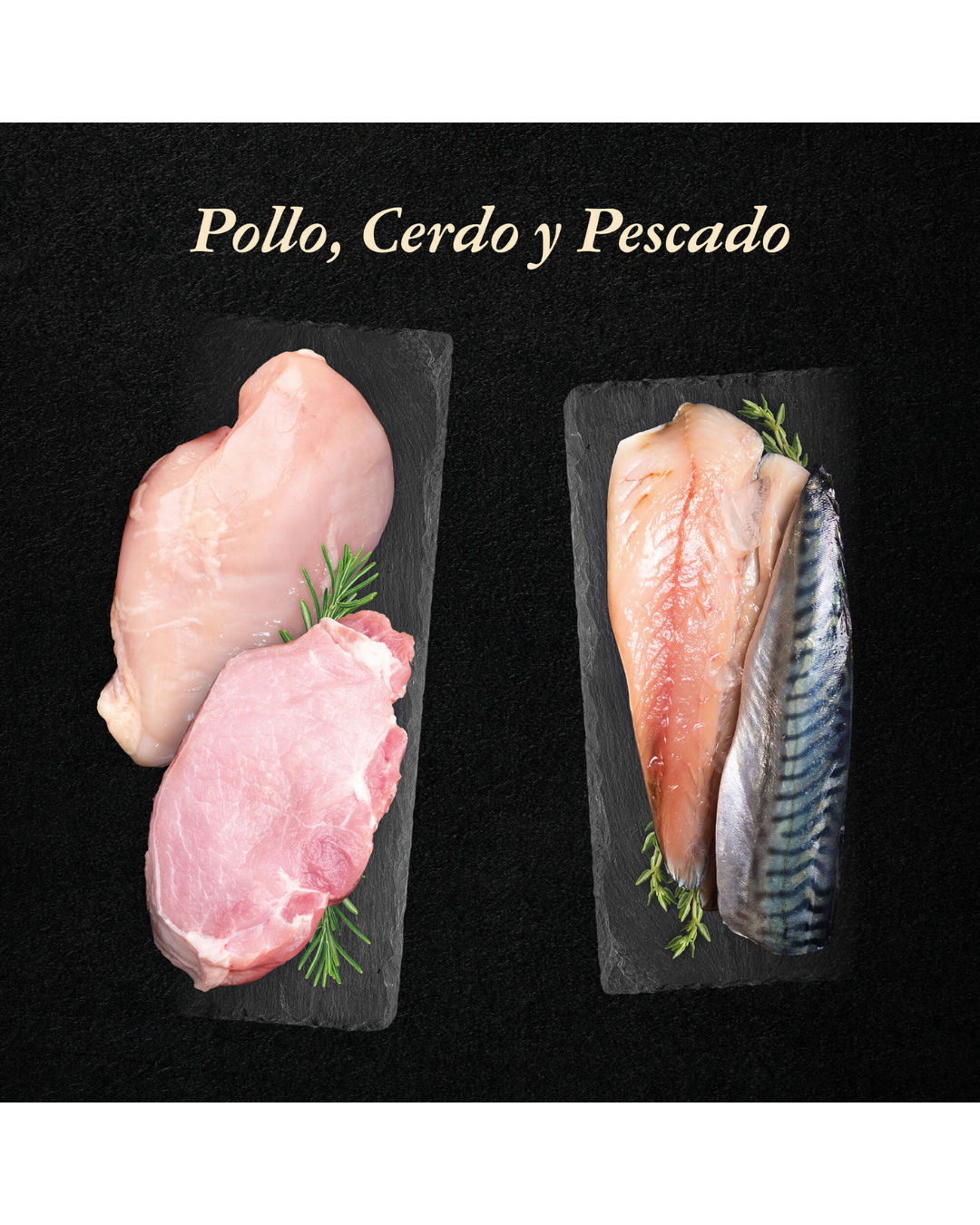 Ingredientes: 30% frango fresco, 26% carne de porco fresca, 22% peixe fresco ( sardinella aurita , cavala Scomber scombrus , carapau Trachurus spp. , sardinha Sardina pilchardus ), amido hidrolisado, tocoferóis de óleos vegetais, extrato de alecrim, ovo desidratado, óleo essencial de orégano, tomilho, cravo, alecrim, canela do Ceilão.