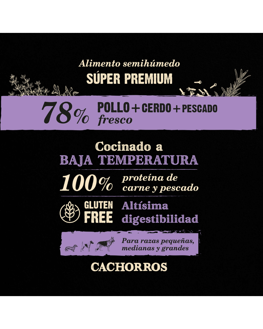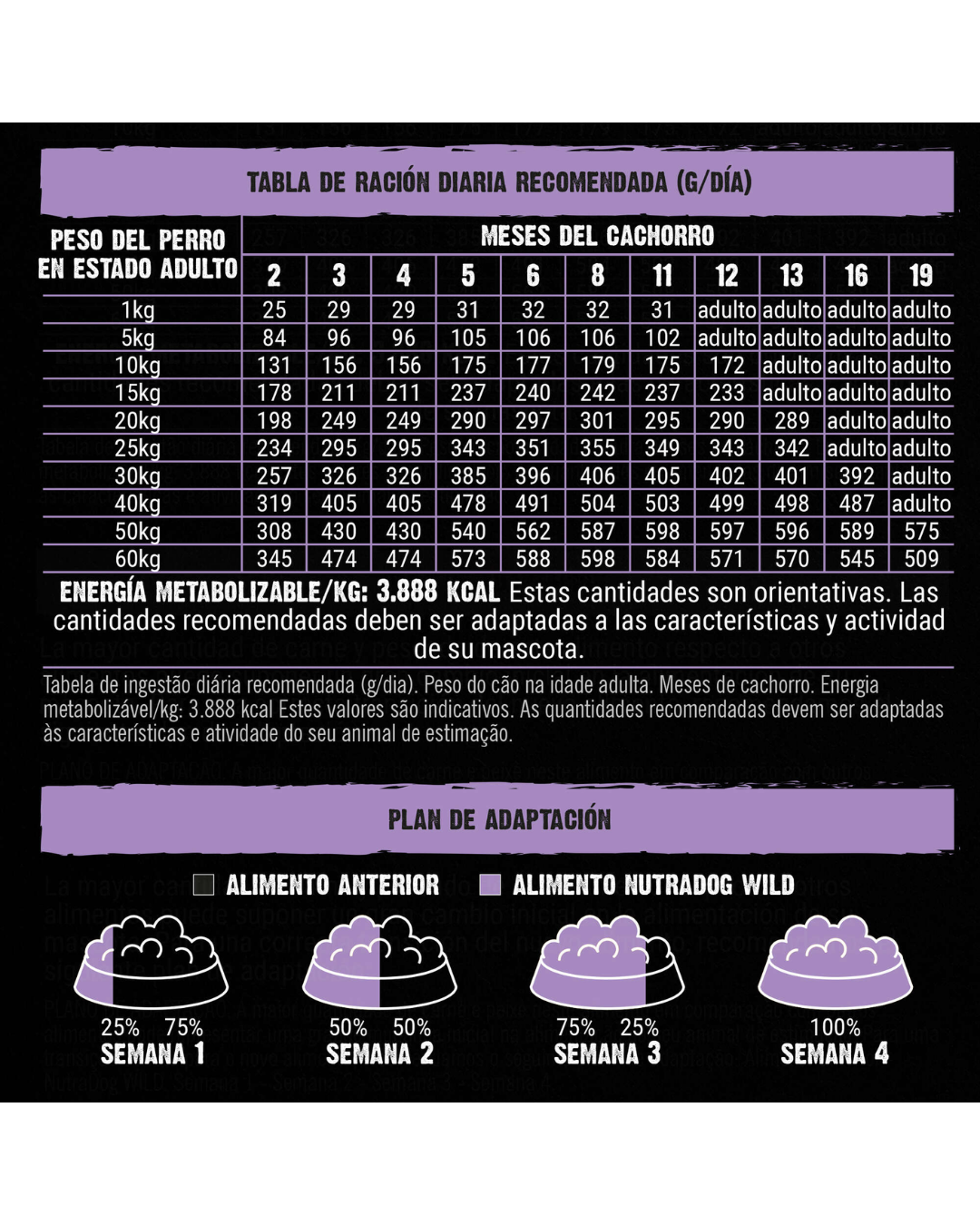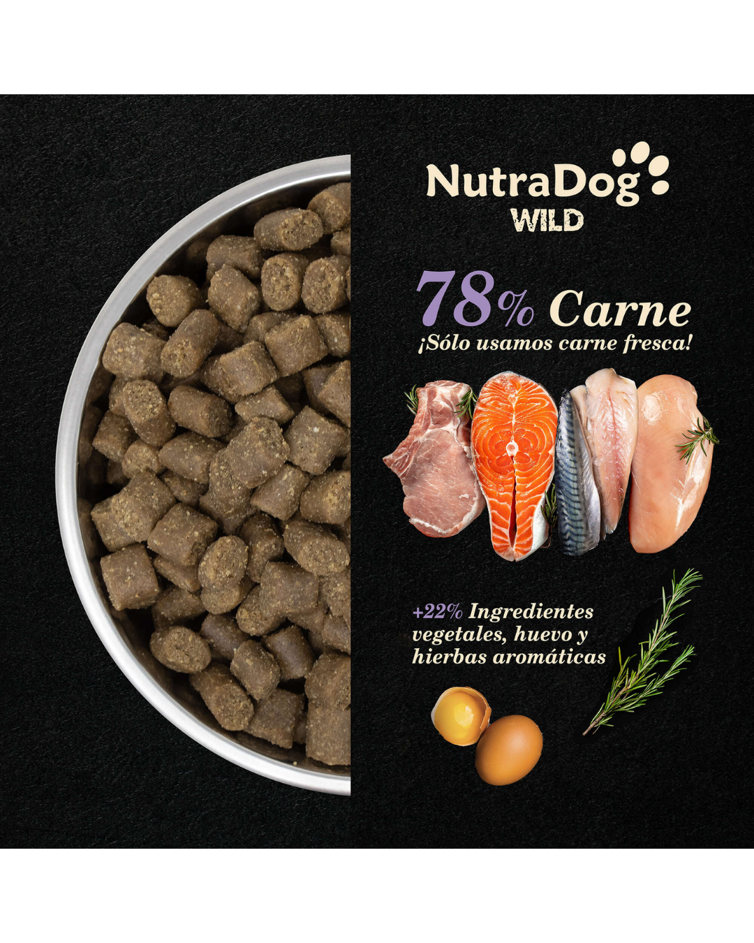 NutraDog WILD 78% Frango + Porco + Peixe é um alimento saboroso e nutritivo para filhotes, feito com 78% de carne e peixe frescos . Fornece uma alta quantidade de proteínas completas e gorduras essenciais , nutrientes muito necessários nos estágios iniciais de desenvolvimento para que nossos cães alcancem um crescimento completo e saudável.